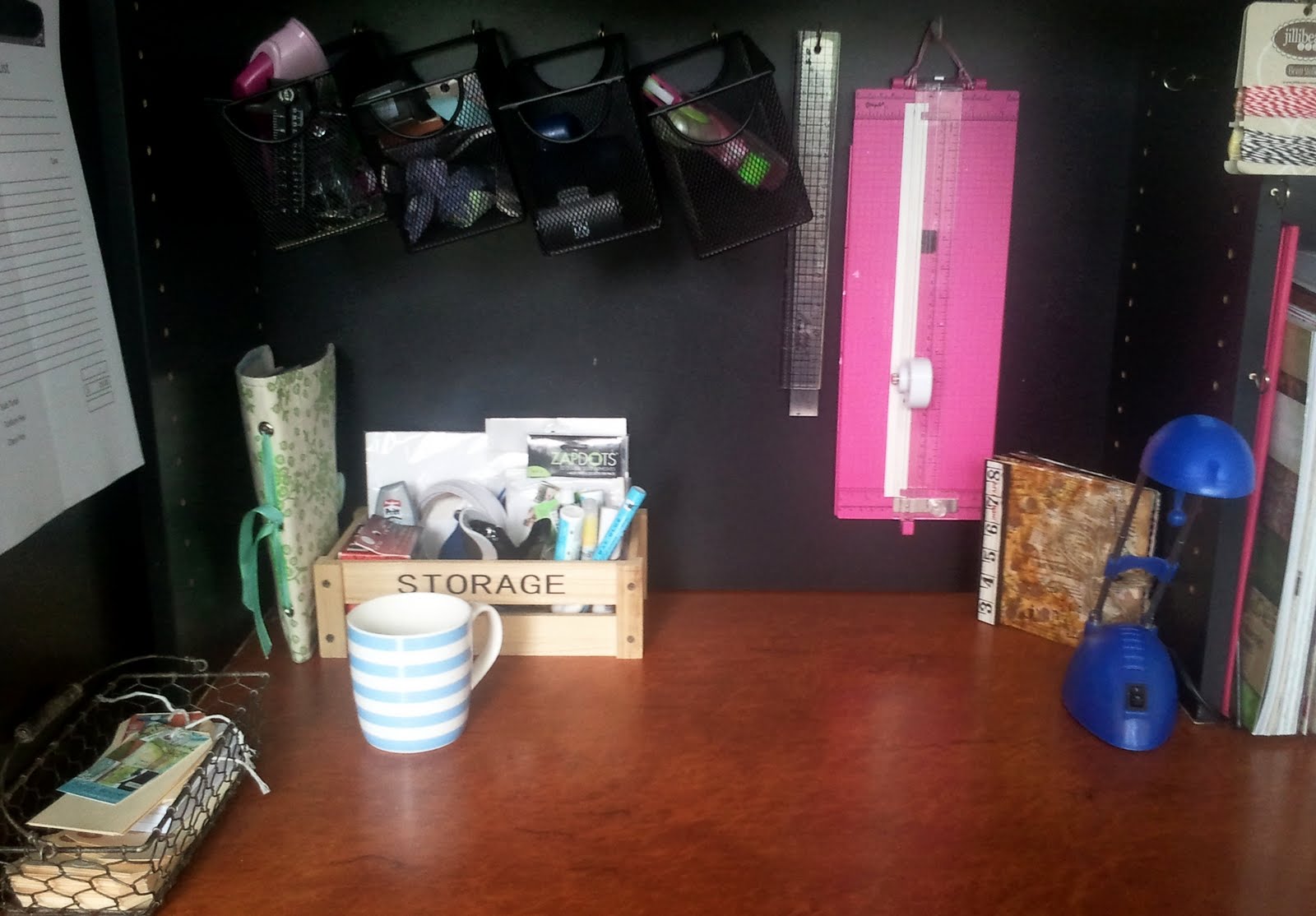 Here is a close up of my desk where all the magic happens LOL!!!! As you can see there is just enough room for 1 layout to be be worked on here. Oh and can you see my clever little ribbon curtain in the background there? I have put a broom handle across from here over to the other cupboard and I bought a $2 plastic shower curtain and got the hooks out it. I have then put similarly coloured ribbons together by stapling them onto some cheap white cardstock/paper and then punching a hole into the top so they can all then be put onto the shower curtain hooks. They all now hang in a colour co-ordinated fashion and I love that they aren't just all shoved in a bag or drawer, this also helps them to get the kinks out of them too.